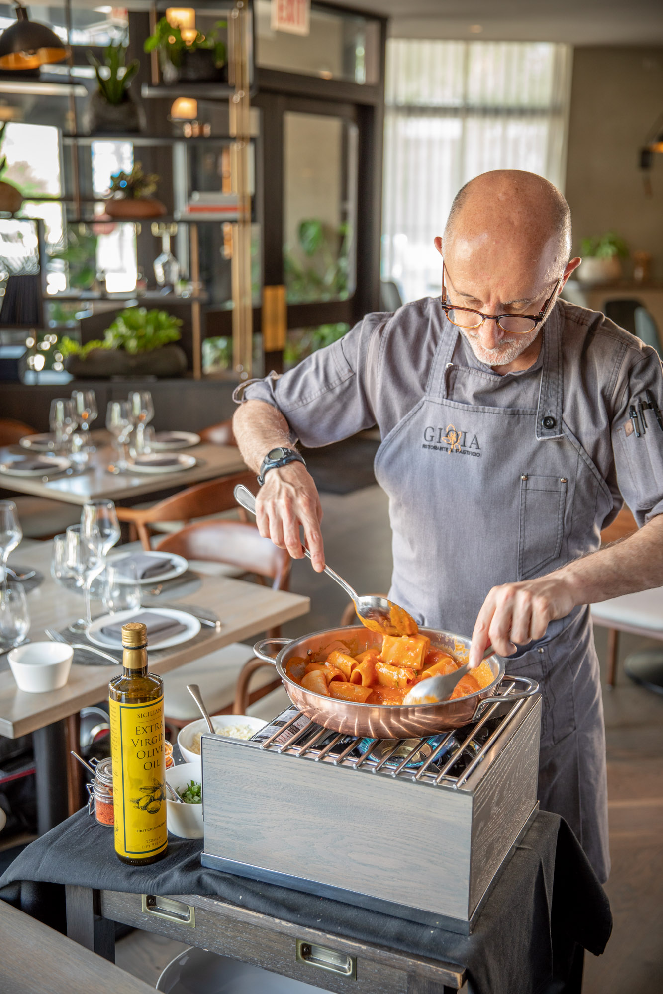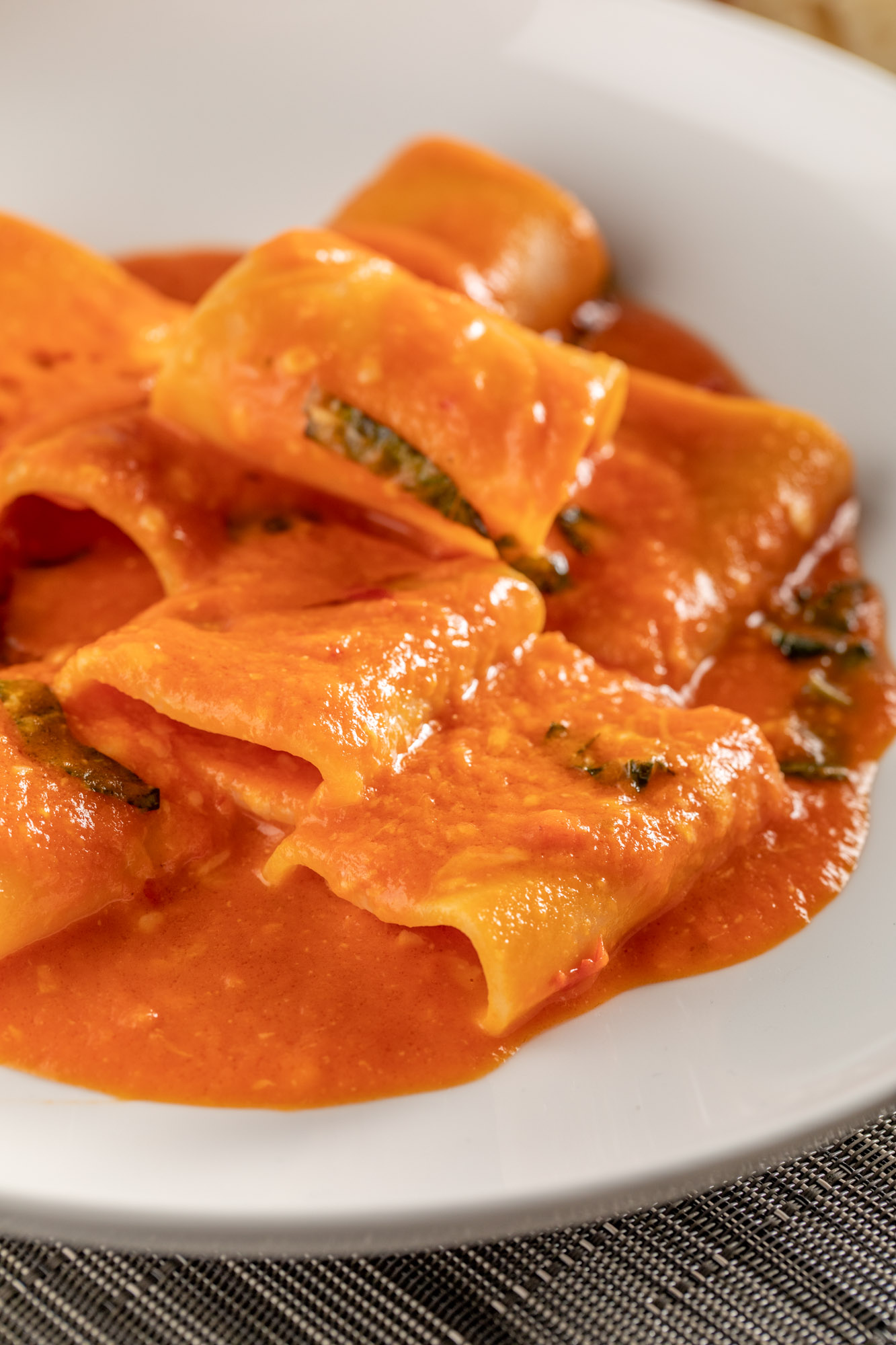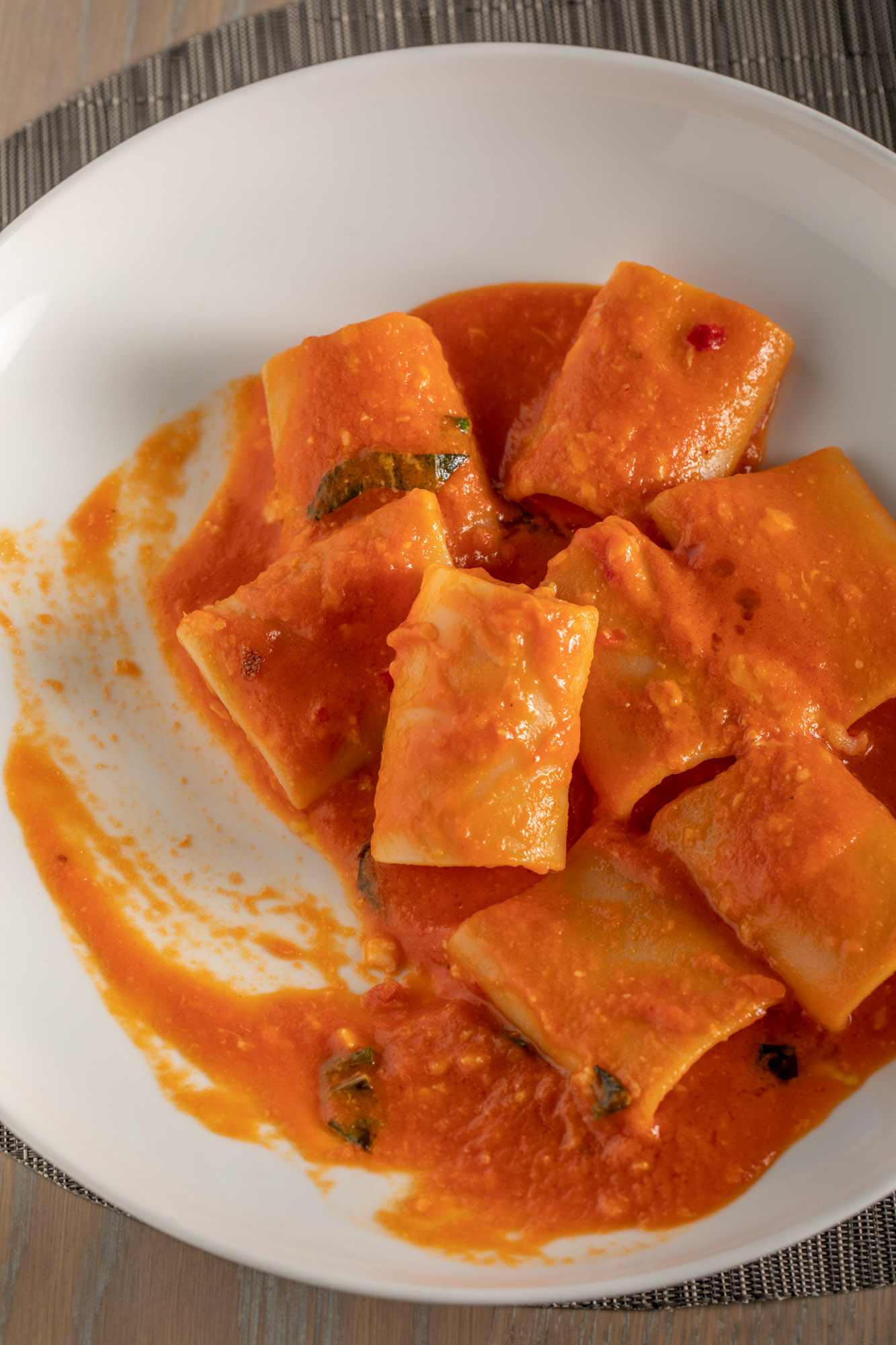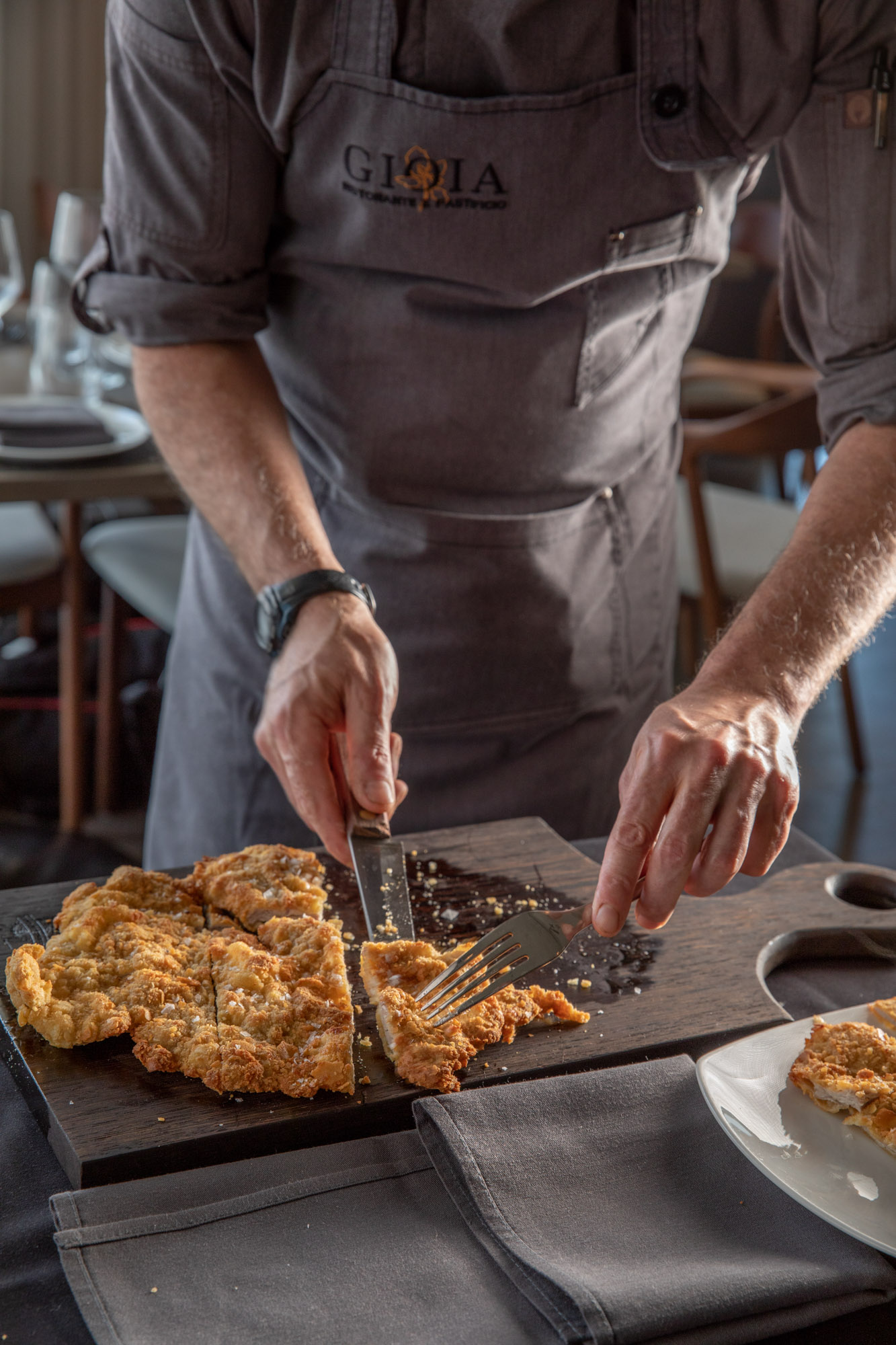 I would describe Gioia as modern Italian cuisine. They have all of the classic dishes that you would expect to find in an Italian restaurant but prepared in a new fresh way. Familiar but definitely not what your Nonna would serve. Maybe she would only make a face and then smile after her first bite. The cacio e pepe is served very much in the classic style but with less cheese and a little sprig of basil. A little variation from what you might typically find but nothing too crazy. When the fluke crude comes she’s probably going to raise an eyebrow. It’s an artfully arranged dish. Thin layers of fish, parmesan cheese, and an artful splatter of sauce. Whether she likes it or not I couldn’t possibly say in advance but I can definitely recommend the Calamarata Pomodoro. The pasta comes in big voluptuous shapes that are drowning in a slightly sweet tomato sauce. The shape of the pasta is designed to allow you to scoop up as much gooey sauce as possible. And when there’s still delicious red streaks on your plate the dish comes with fresh baked bread to soak it up with. It’s also prepared table side and the show is definitely a part of the meal.